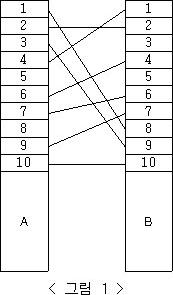 예를 들어, <그림 1>과 같이 전깃줄이 연결되어 있는 경우 A의 1번 위치와 B의 8번 위치를 잇는 전깃줄, A의 3번 위치와 B의 9번 위치를 잇는 전깃줄, A의 4번 위치와 B의 1번 위치를 잇는 전깃줄을 없애면 남아있는 모든 전깃줄이 서로 교차하지 않게 된다.