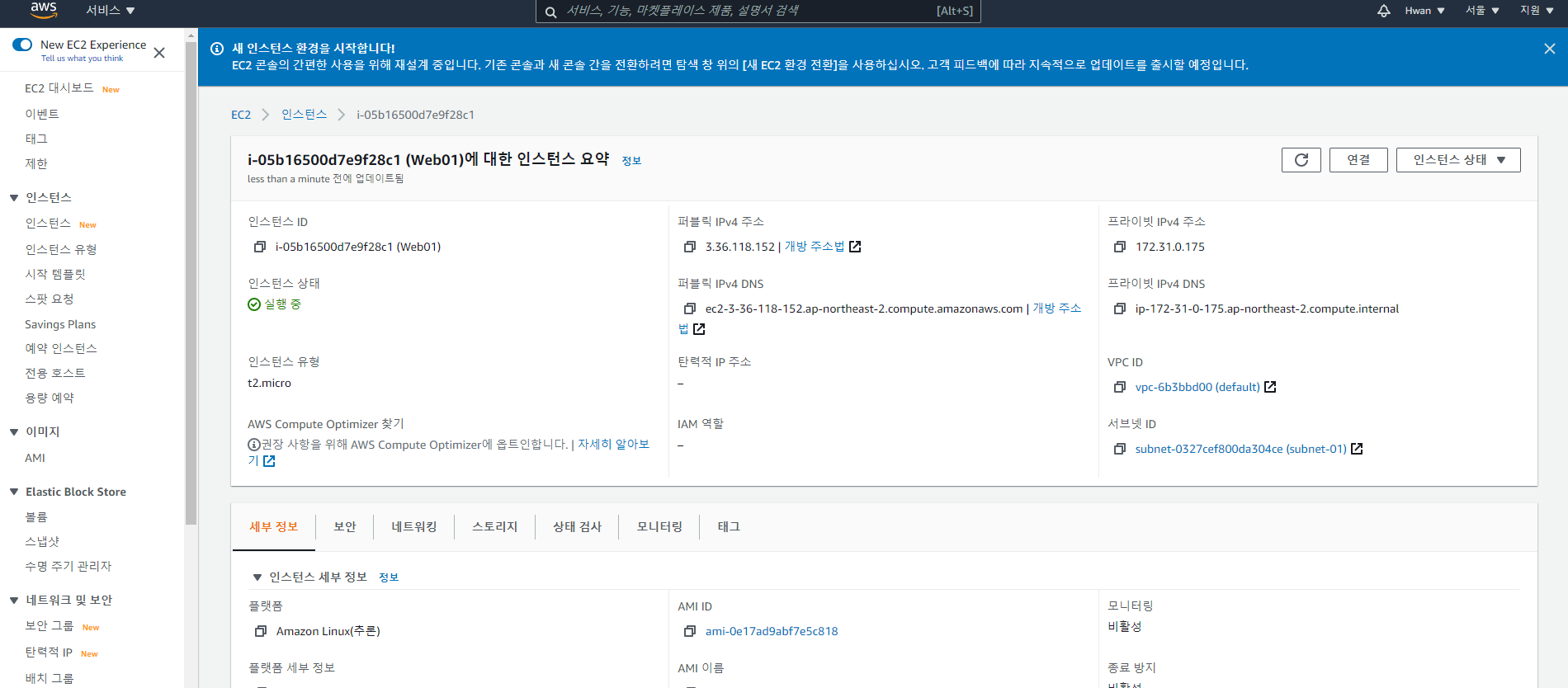 중지 후 다시 시작을 하게되면 DHCP서버에서 퍼블릭 IP 주소를 다시 할당 받습니다.