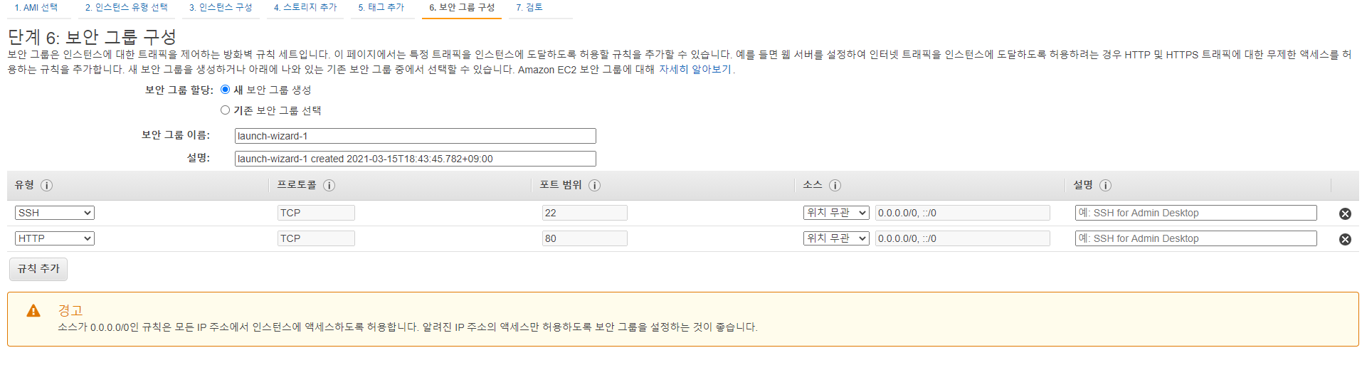 다음 6단계에는 보안 그룹 구성입니다. EC2는 포트에 대한 관리를 여기서 진행하게 됩니다.