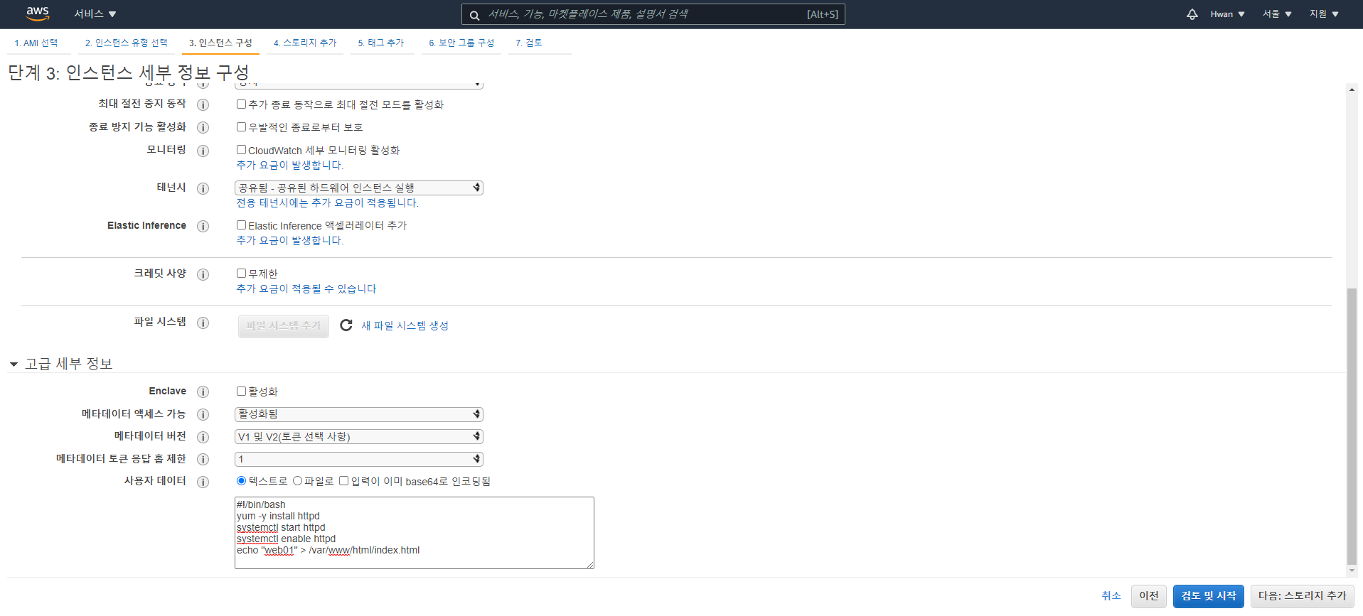 해당 부분을 체크하고 오른쪽 하단에 "다음 : 인스턴스 세부 정보 구성" 을 눌러주시면 됩니다.