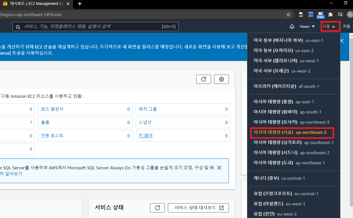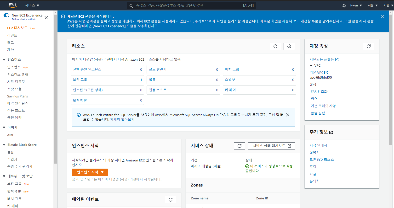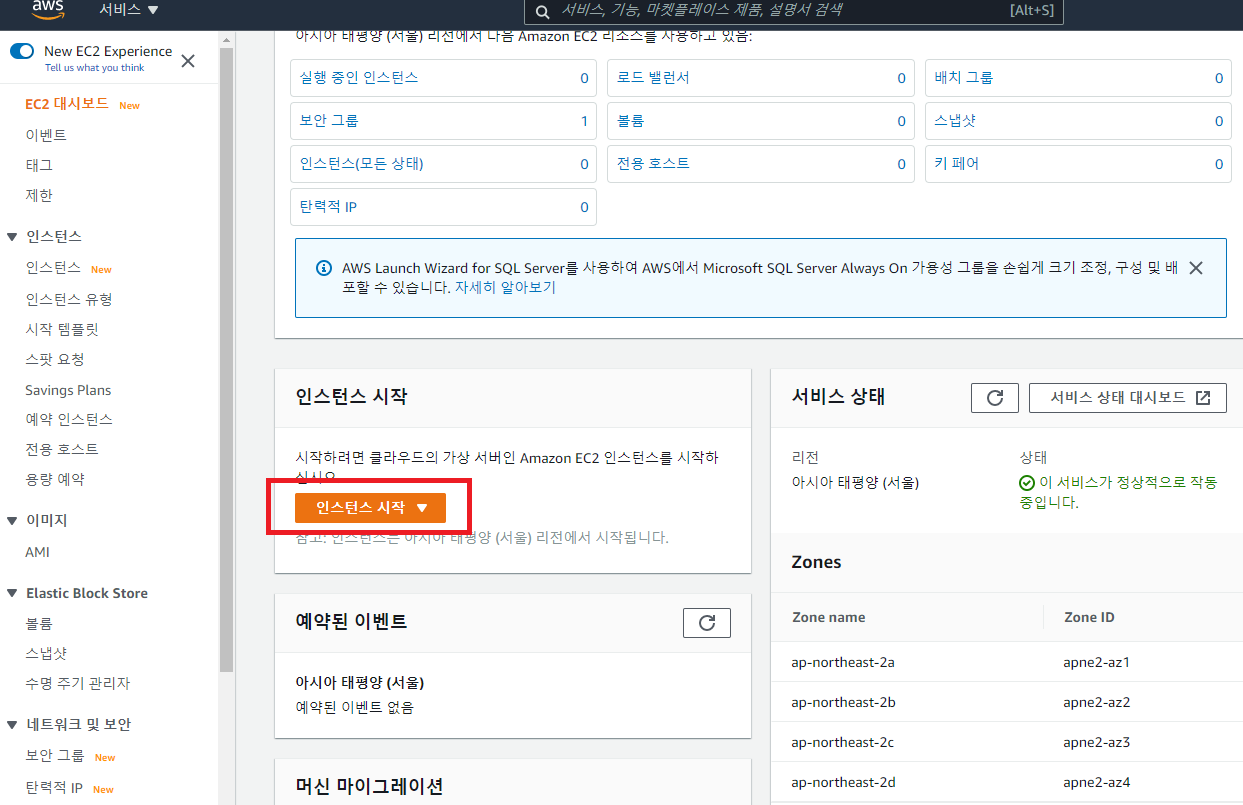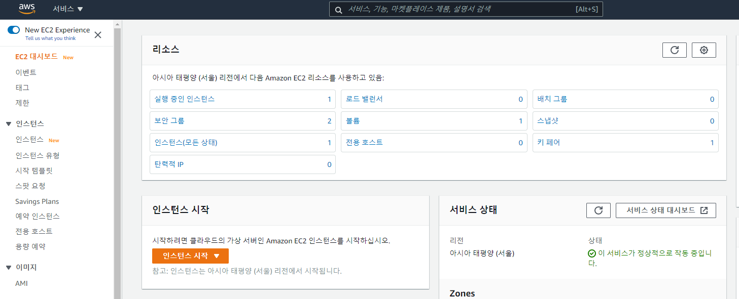 EC2 대시보드 화면입니다. 대시보드에서 전체적인 리소스를 볼 수 있으며, 불필요하거나 사용하지 않는걸 찾아서 삭제해주시면 관리가 편합니다.