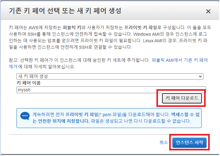 위 설정대로 하신 후 "키 페어 다운로드"를 누르시면 SSH로 접속할 수 있는 private key를 내려받습니다.