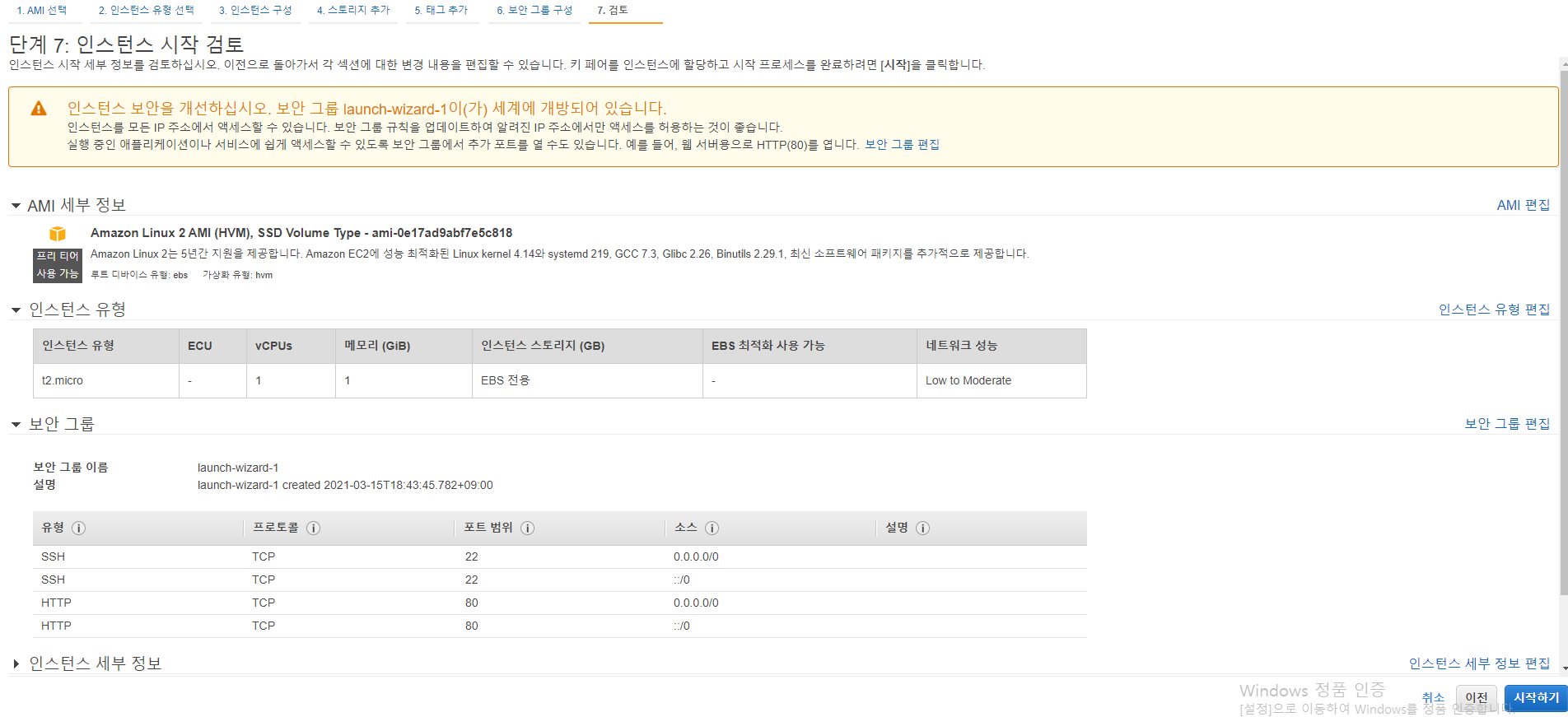 인스턴스 시작 클릭 -> 인스턴스 시작.