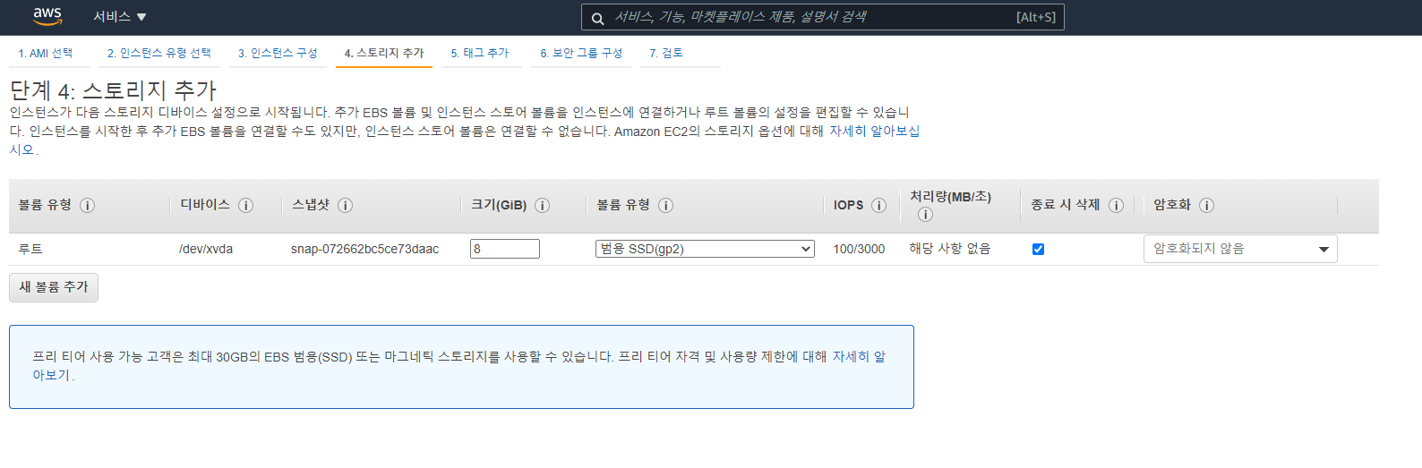 이 부분은 나중에 인스턴스(EC2)를 지울 때 같이 EBS에 저장된 내용도 삭제할지에 대한 체크 입니다.
