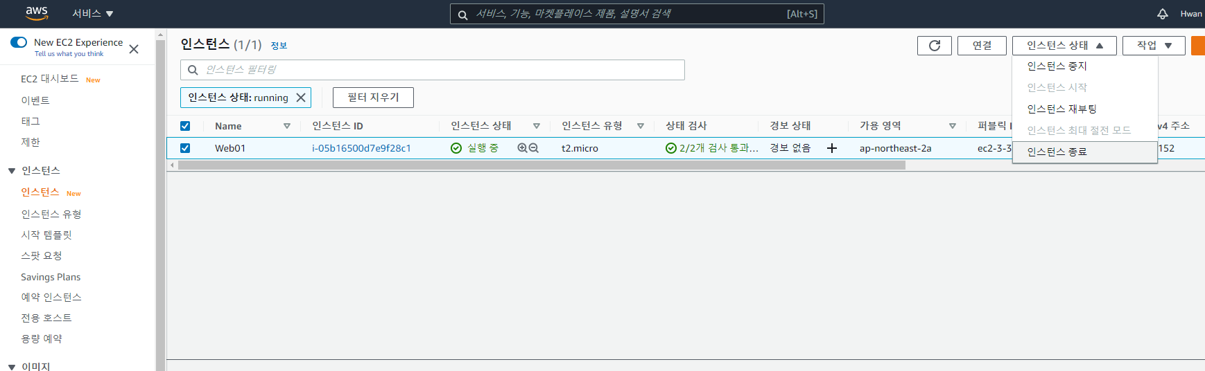 해당 인스턴스 상태 창입니다. 여기서 인스턴스 상태 부분에 인스턴스 종료가 있습니다.