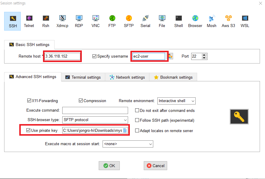 3번째 빨간색 네모박스 부분에 저희가 인스턴스 만들 때 다운 받았던 private key를 넣어주면 됩니다.