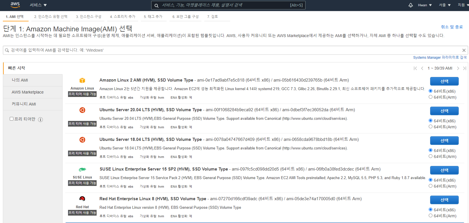 해당 이미지가 뜨면 맨 위에 있는 Amazon Linux 2 AMI를 선택해 줍니다.