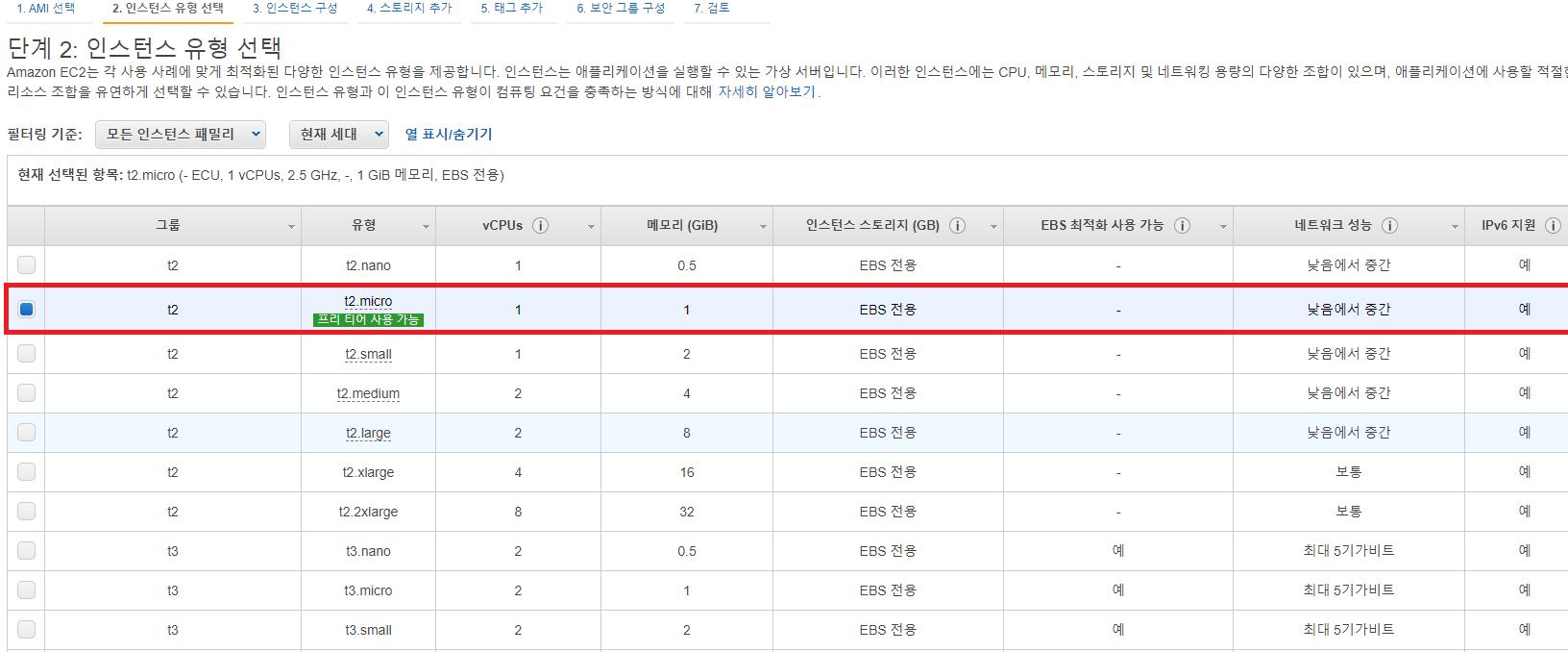 기본적으로 체크되어 있는 부분을 보면 t2(프리티어 사용가능) 이라고 되어있습니다.