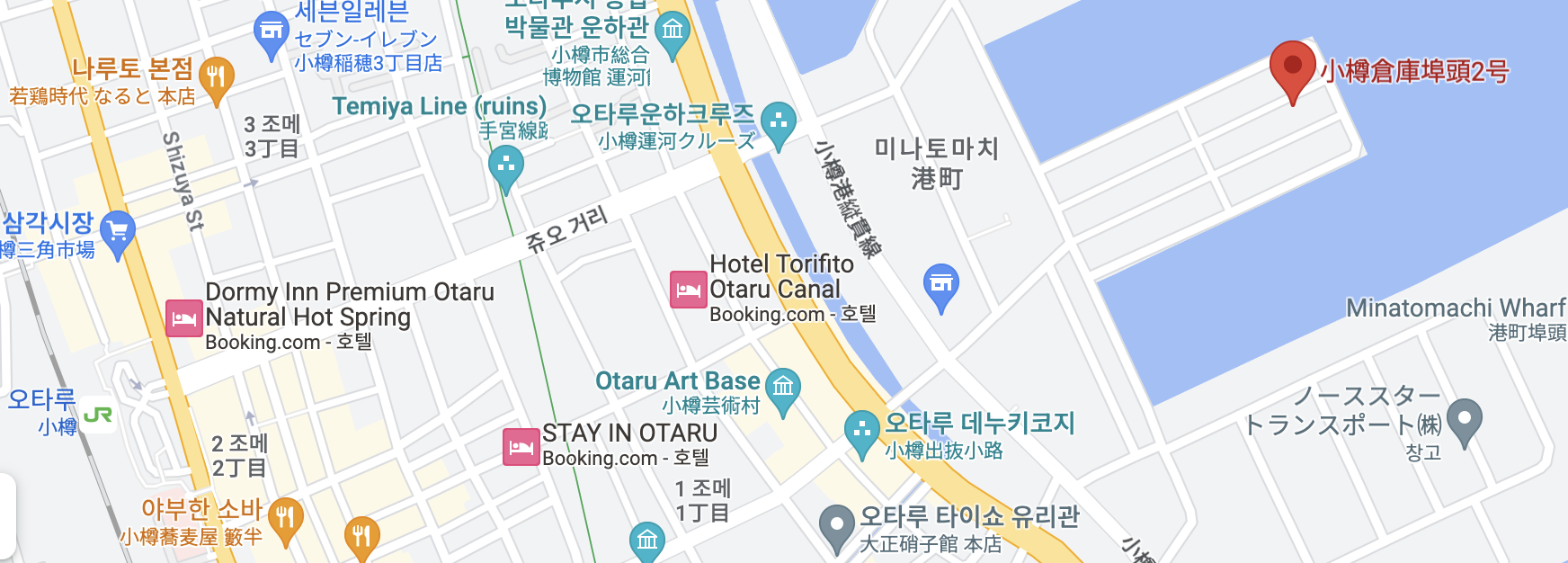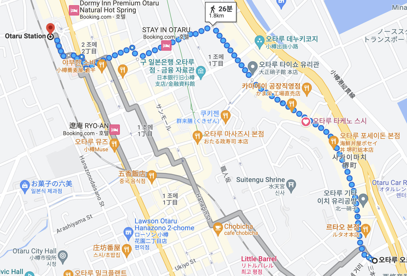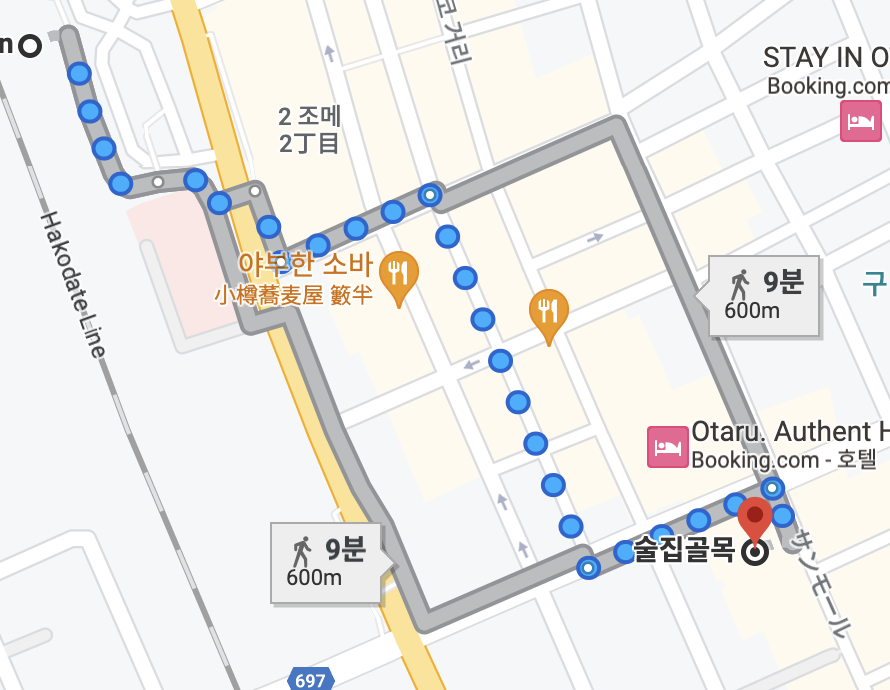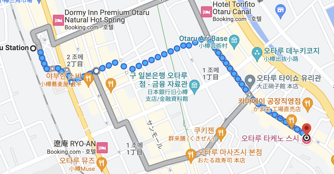 오타루에서 유명한 관공 코스중 하나인 오르골당이 있는 곳 까지의 경로 입니다.