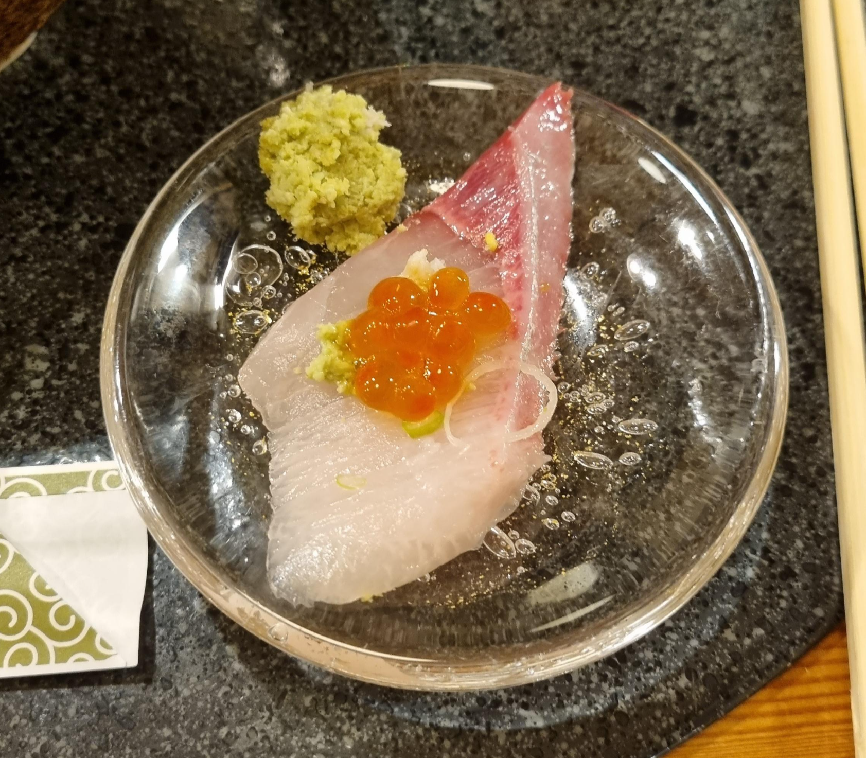 그다음 새우, 다진 게살, 연어 회, 날치알, 돔 뱃살 부분 다진거, 갑오징어, 다테마키 이렇게 있었습니다.
