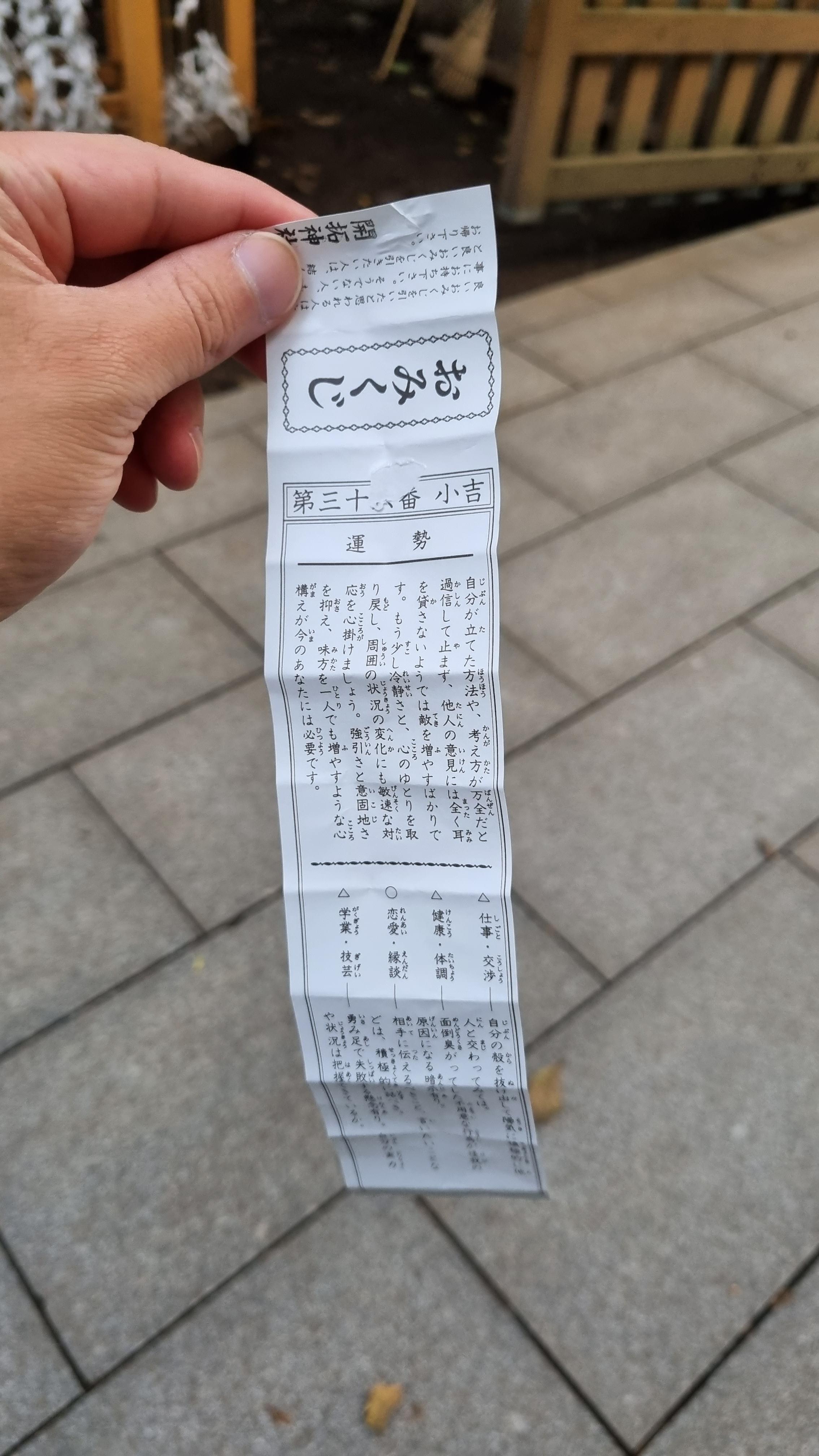 신궁 입구에서 조금 가다보면 옆에 작은 신사 하나가 있습니다. 거기서 오미쿠지를 뽑았는데 소길이 나왔네요.